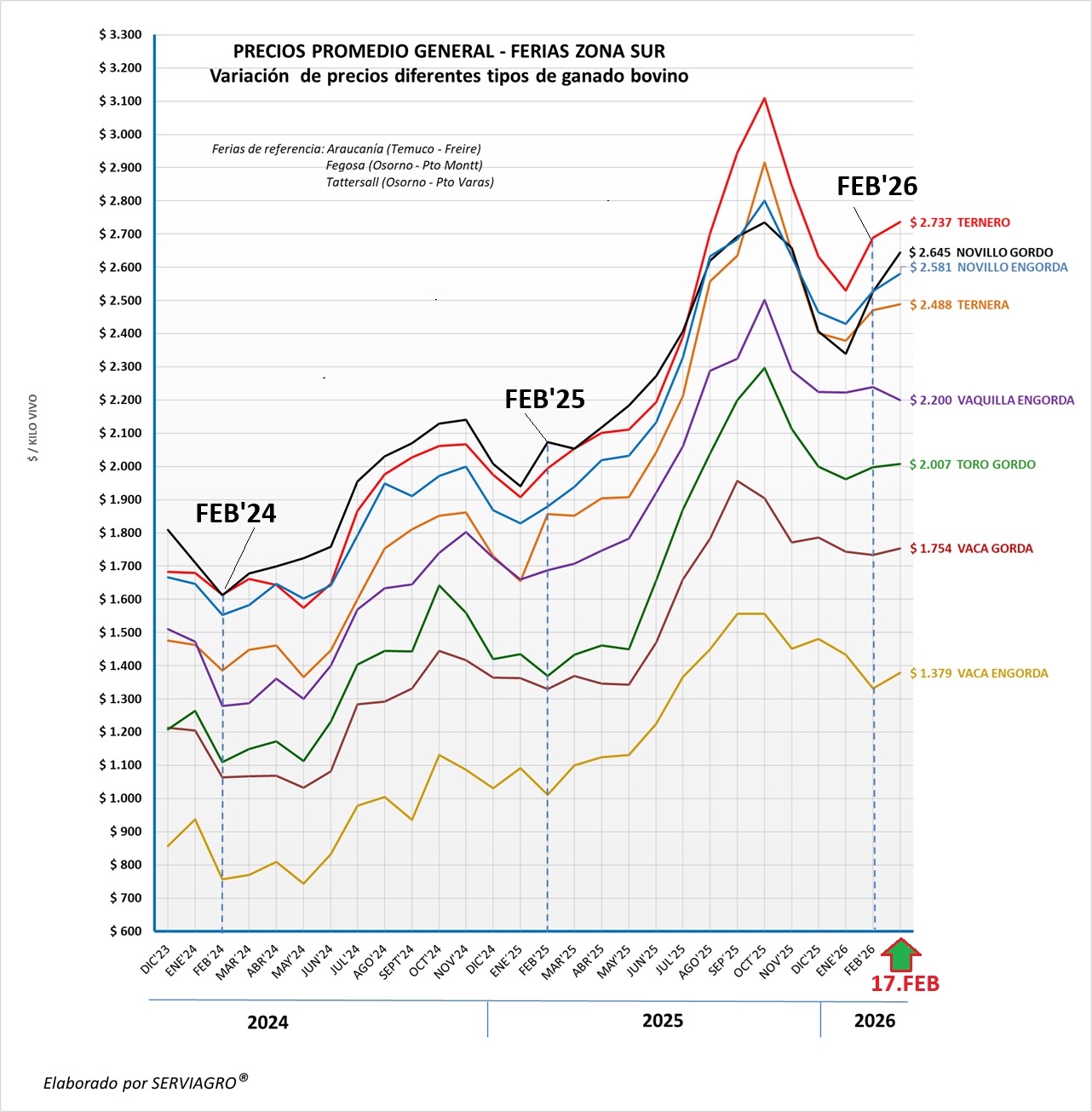 PRECIO GANADO BOVINO PRECIO GANADO BOVINO PRECIOS FERIAS ZONA SUR (Semana del 10 al 17 de Febrero 2026) https://fegosa.wixsite.com/misitio/puerto-montt https://www.tattersallganado.cl/#precios http://feriasaraucania.cl/precios.aspx